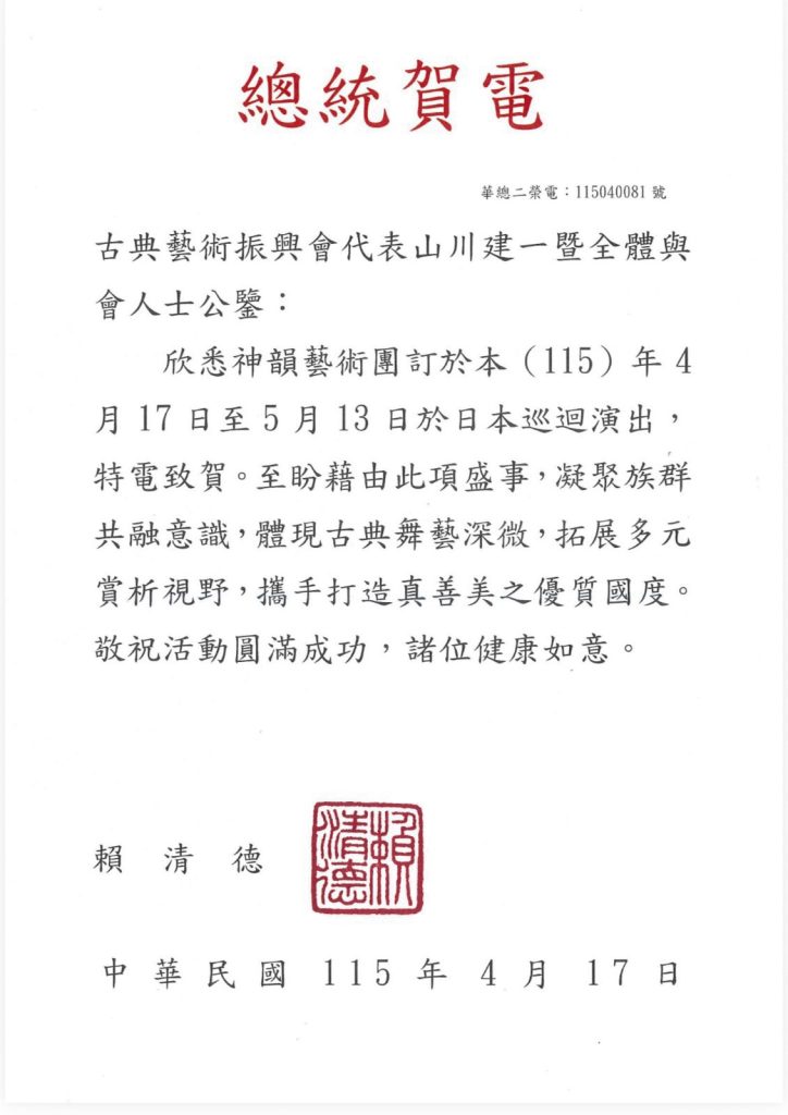 欣悉神韻藝術團訂於本(115)年 4 月 17 日至 5 月 13 日於日本巡迴演出,特電致賀。至盼藉由此項盛事,凝聚族群共融意識,體現古典舞藝深微,拓展多元賞析視野,攜手打造真善美之優質國度。敬祝活動圓滿成功,諸位健康如意。